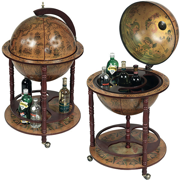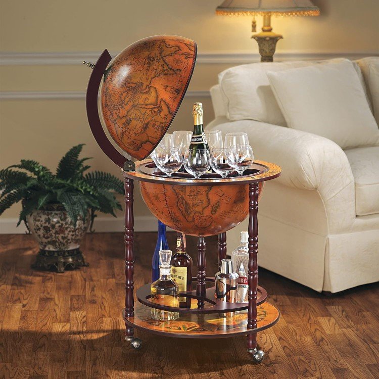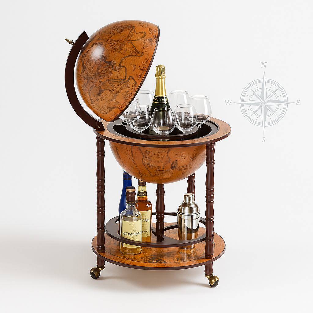 פריט עיצובי מרשים שמעלה חיוך בכל פתיחה. גלובוס בר מסתובב על גלגלים עם מקום לבקבוקים ולכוסות – שילוב מושלם של יוקרה, שימושיות וסטייל אירופאי עתיק.