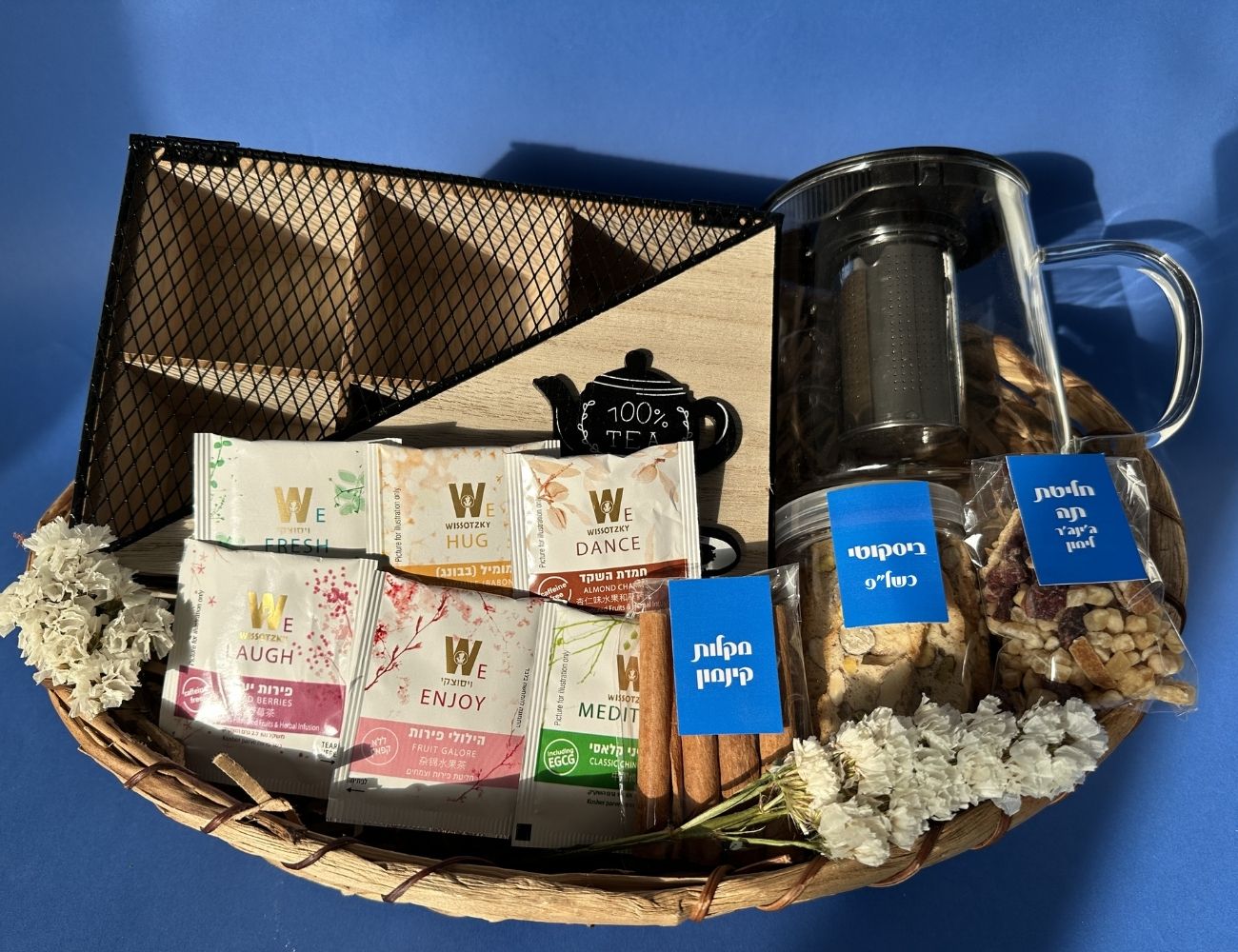 המארז מגיע בתוך סלסלת קש חגיגית ומעוצבת וכולל: