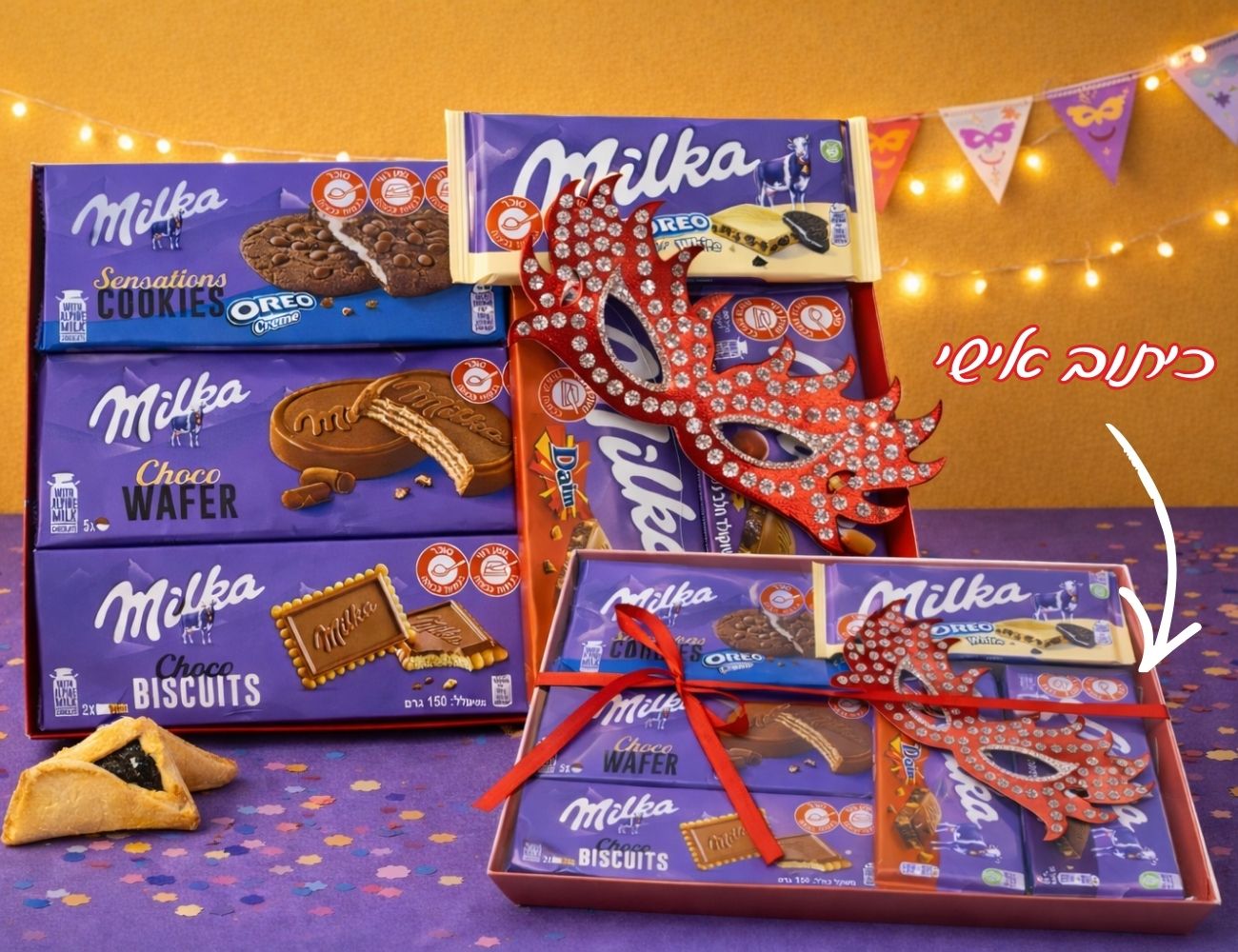 🎭 משלוח מנות ענק בקופסה צבעונית – חגיגה אמיתית של שוקולד מילקה לפורים!