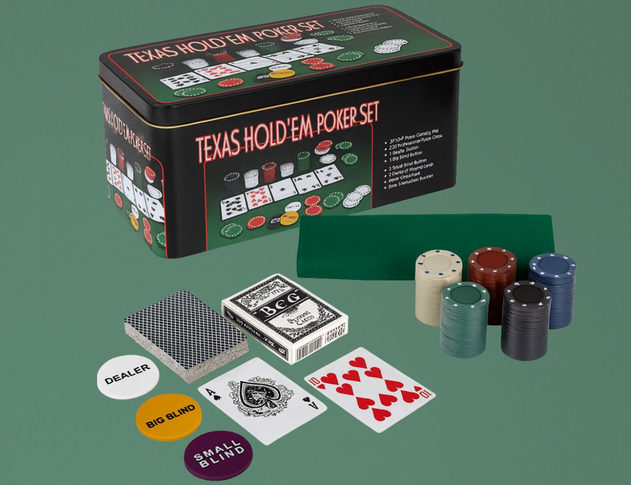 מארז הפוקר מכיל חפיסת קלפי פוקר איכותית וסט צ'יפים צבעוניים כמו בקזינו אמיתי. הכל ארוז בקופסה קטנה ומעוצבת שתוכלו לקחת לכל מקום – מושלם לפיקניק, חופשה או ערב חברים.