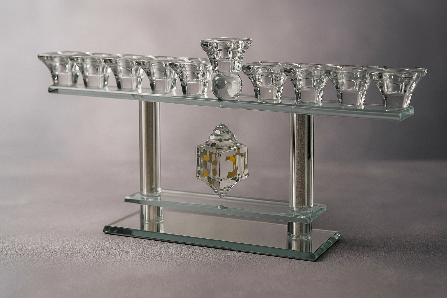 חנוכייה מרהיבה מזכוכית קריסטלית איכותית, עם עיצוב נקי, סימטרי ומודרני. הפריט המושלם לשולחן החג, למשרד או כמתנה מהודרת לחנוכה – שמביא אור ויוקרה לכל פינה.