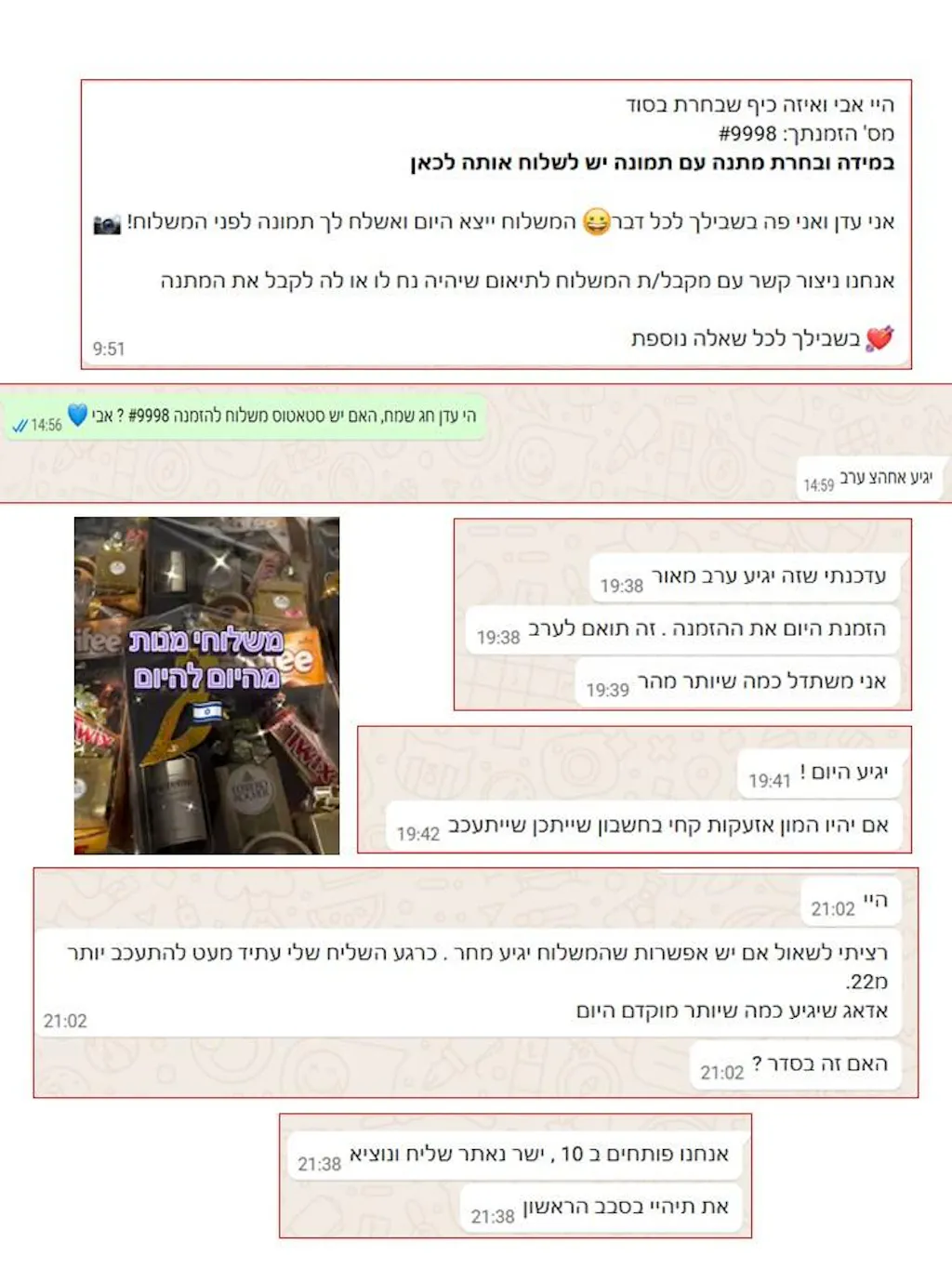 שירות מאכזב, בפורים אשתי התקשרה בבוקר ובקשה לדעת אם למרות המצב יש שירות משלוחים מהיום להיום לכפר סבא. תשובתכם הייתה חיובית והפנו אותה לבצע הזמנה באתר . לאחר ביצוע ההזמנה באתר (בשעה 09.20) סימנתי את האפשרות מהיום להיום בתוספת כ 50 ש"ח וקבלתי מייד תשובה שאישרה את ההזמנה תוך הבטחה שהמשלוח יסופק עוד היום. בשעות הצהרים ביקשתי לקבל סטאטוס משלוח ונעניתי שיסופק בין השעות 18.00-22.00 ואז ביקשתי להקדים משום שנכדיי הם ילדים בני 5 והולכים לישון בשעה מוקדמת. בסביבות השעה 21.20 נשאלתי אם ניתן לדחות את המשלוח למחרת משום שהשליח לא יספיק להגיע עד לשעה 22.00, הסכמתי בתנאי שהמשלוח יגיע למחרת בשעות הבוקר, עמית הבטיח שמחר בשעה 10.00 עם הפתיחה ידאג למצוא שליח וישלח את המשלוח לכפר סבא כדי שיסופק עד השעה 12.00. החל מהצהרים כשביקשתי סטאטוס מסירה משכו אותי בכל מיני סיפורים על המצב הביטחוני שיום קודם אישרו שעובדים רגיל, השיא היה בשעה 14.30 נאמר לי שהמשלוח יגיע מהספק בשעה 15.00 ומייד יצא לחלוקה. כשאלתי כיצד זה יתכן הרי אתמול נאמר לי שהשליח בדרכו אך בגלל אזעקות הוא לא יגיע בזמן הסתבך עמית בתשובתו ונאחז במצב הביטחוני ,וטען שהשליחים חוששים והוא עושה כמיטב יכולתו עבורי ותמיד המשלוחים מגיעים בזמן. לבסוף משלוח פורים הגיע למחרת פורים בשעה 19.20 וגרם לנו(סבא וסבתא) לעוגמת נפש. בקיצור חברה הגובה פרמיה על שירות אקספרס ומבטיחה שירות אישי ומאשרת שירות מהיום להיום, אינה יכולה להתנהל במערכת של הבטחות שווא ושימוש ציני במצב ביטחוני ותירוצים שונים ומשונים .כל ההתכתבות הנ"ל מתועדת וחבל שזה השירות שאתם סיפקתם לנו.