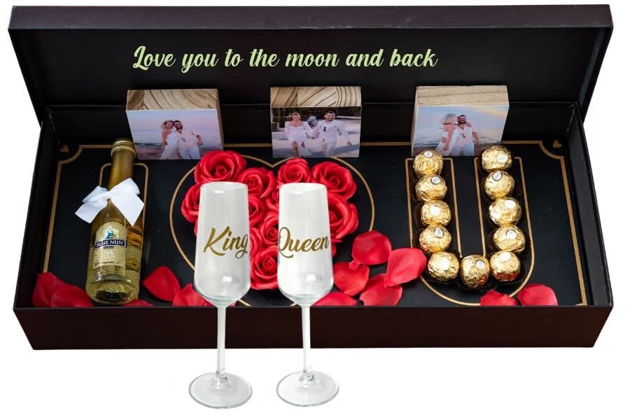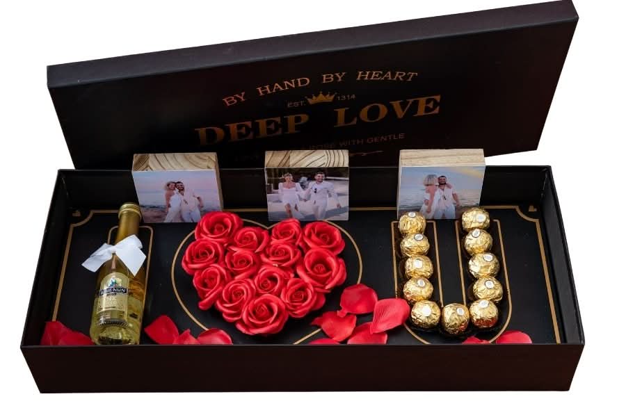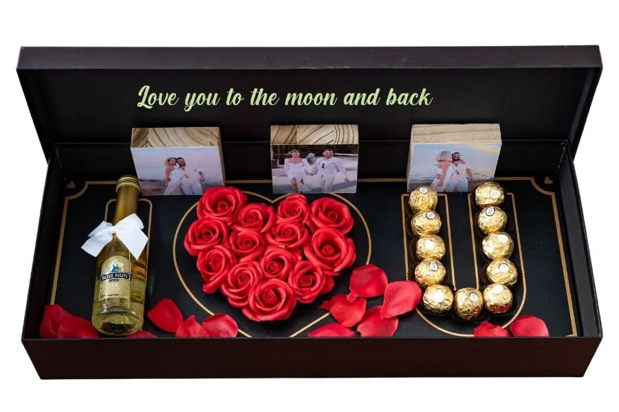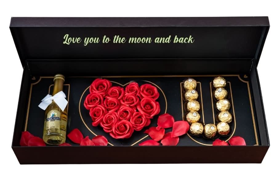 מארז שיש בו הכל-פררו רושה, וורדי משי,בקבוק בלו נאן וכיתוב אישי.