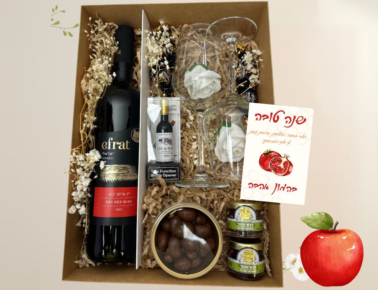 מארז יין אדום עם מגוון תוספות שיהפכו את השנה הזו מלאה בחום ואהבה — בדיוק כמו יין אדום מפנק.